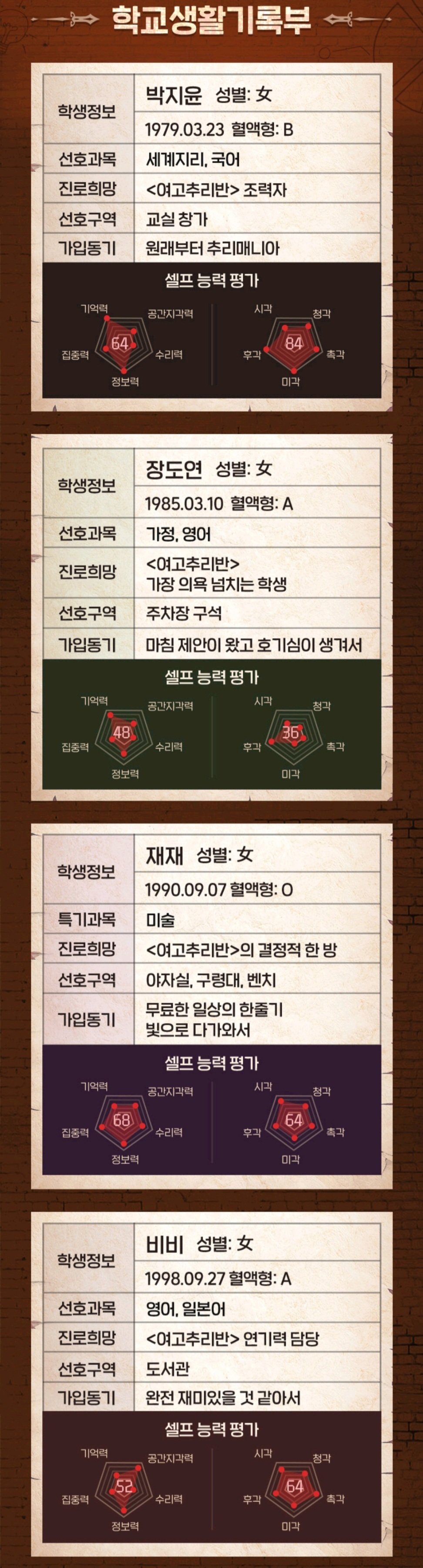 여고추리반 가입신청서 : '여고추리반'은 21일 수요일을 시작으로 2주간 수요일, 목요일 밤 10시 30분 tvn에서 방송된다.. 오늘부터 나도 #여고추리반 원임 랜선 가입신청 참 쉽죠~? 여고추리반 정종연pd 재재 박지윤 장도연 비비 최예나 가입신청서 시간. 티빙 측은 추리잘알, '여고추리반' 신입부원 모집이라며 곳곳에 놓여진 단서를 따라 숨겨진 가입신청서를 찾는 것이 미션!이라는 말을 남겼다. <여고추리반>의 모태는 여고를 배경으로 한 많은 스릴러물들의 클리셰를 통해 탄생한 <대탈출>의 '태양여고' 에피소드였다. 티빙 공식 인스타그램에서 상세 이벤트 방법.
